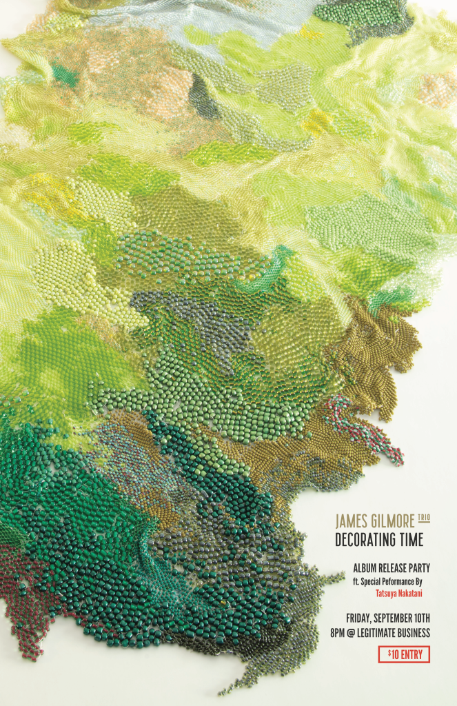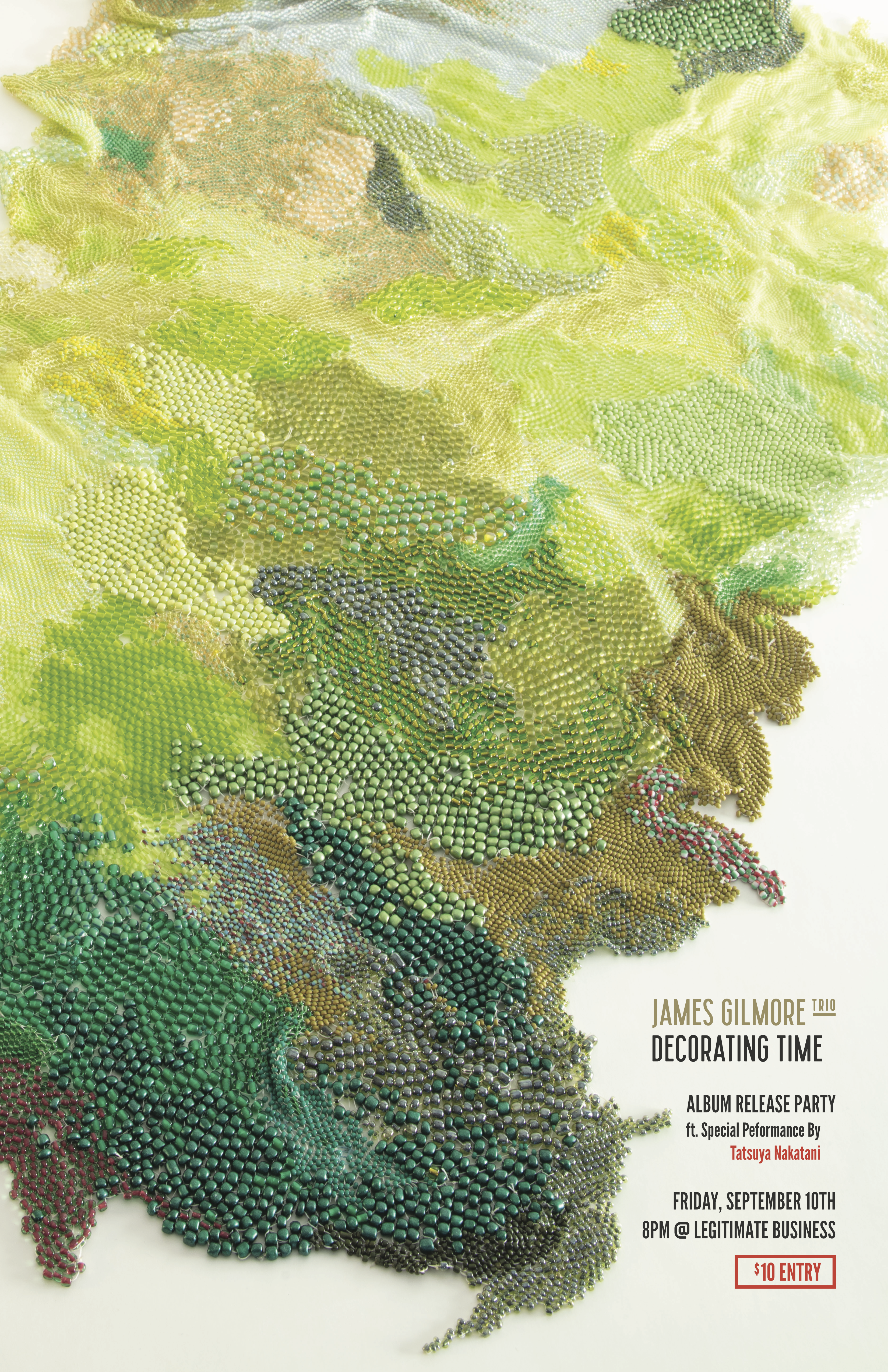 The release party for Decorating Time will be at Legitimate Business in Greensboro on September 10th @ 8pm, and will feature a special opening set by Tatsuya Nakatani. The artwork on the flyer is a beadwork by Jenna Schwartz called ‘Out to Pasture’; the photo is by Harrison Haynes and the flyer design is by Andrew Duke.